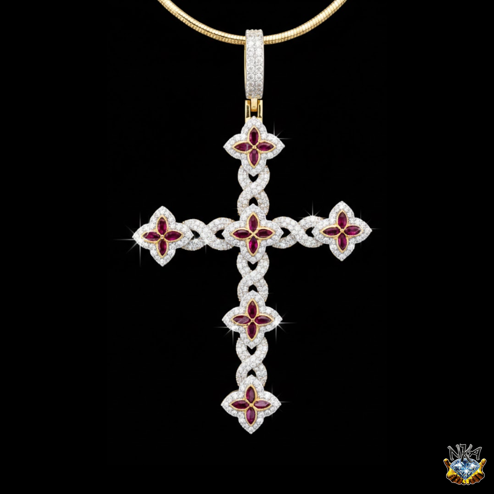 Une alliance de foi et d’élégance printanière. Ce pendentif en or 14 carats réinterprète la croix classique avec une délicatesse florale exceptionnelle. Sa structure est composée d’un entrelacement gracieux d’or et de cristaux, ponctué de motifs de fleurs quadrilobées. Chaque fleur est centrée sur quatre pierres d’un rouge passion intense, créant un contraste vibrant et luxueux avec le métal précieux et le pavage étincelant.
